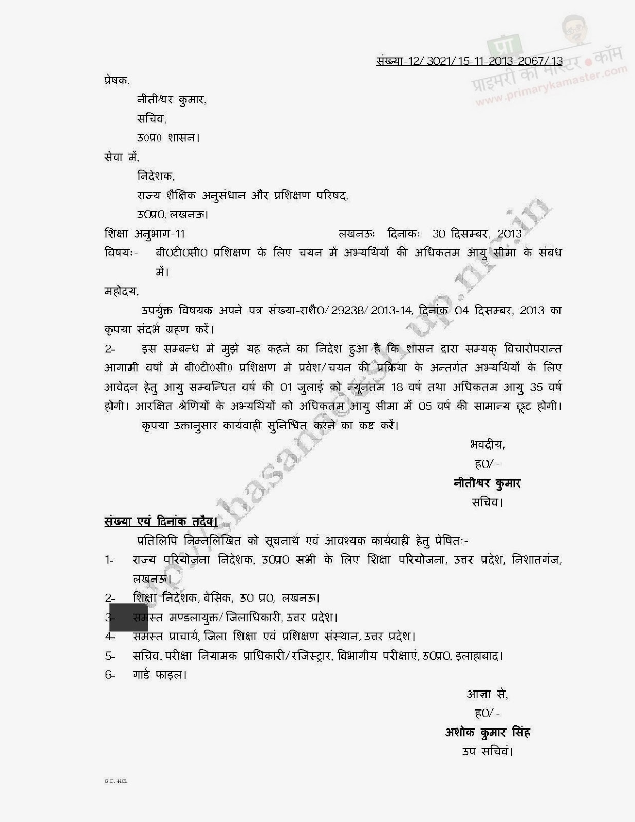 बी0टी0सी0 प्रशिक्षण के लिए चयन में अभ्यर्थियों की अधिकतम आयु सीमा के संबंध में शासनादेश