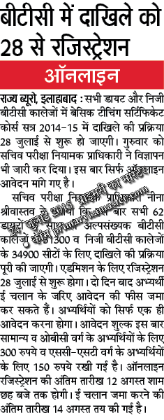 बीटीसी 2014 के लिए आवेदन 28 जुलाई से, अभ्यर्थी बीटीसी-2014 में प्रवेश के लिए ऑन लाइन आवेदन कर सकेंगे (विज्ञप्ति यहाँ देखें)