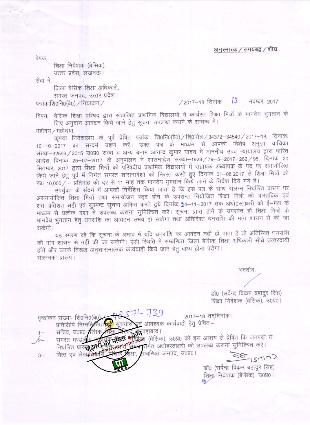बेसिक शिक्षा परिषद द्वारा संचालित प्राथमिक विद्यालयों में कार्यरत शिक्षा मित्रों के मानदेय भुगतान किये जाने हेतु सूचना उपलब्ध कराने के संबंध में आदेश जारी