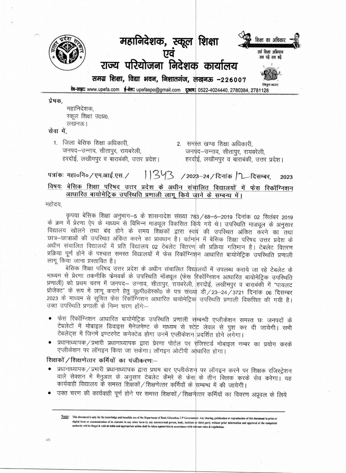 बेसिक शिक्षा परिषद उत्तर प्रदेश के अधीन संचालित विद्यालयों में फेस रिकॉग्निशन आधारित बायोमेट्रिक उपस्थिति प्रणाली लागू किये जाने के सम्बन्ध में